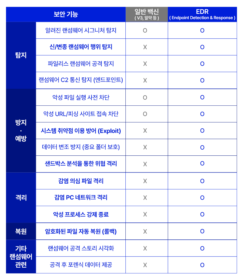 랜섬웨어의 모든단계를 감시하고 대응 및 복원까지 가능한 서비스입니다.